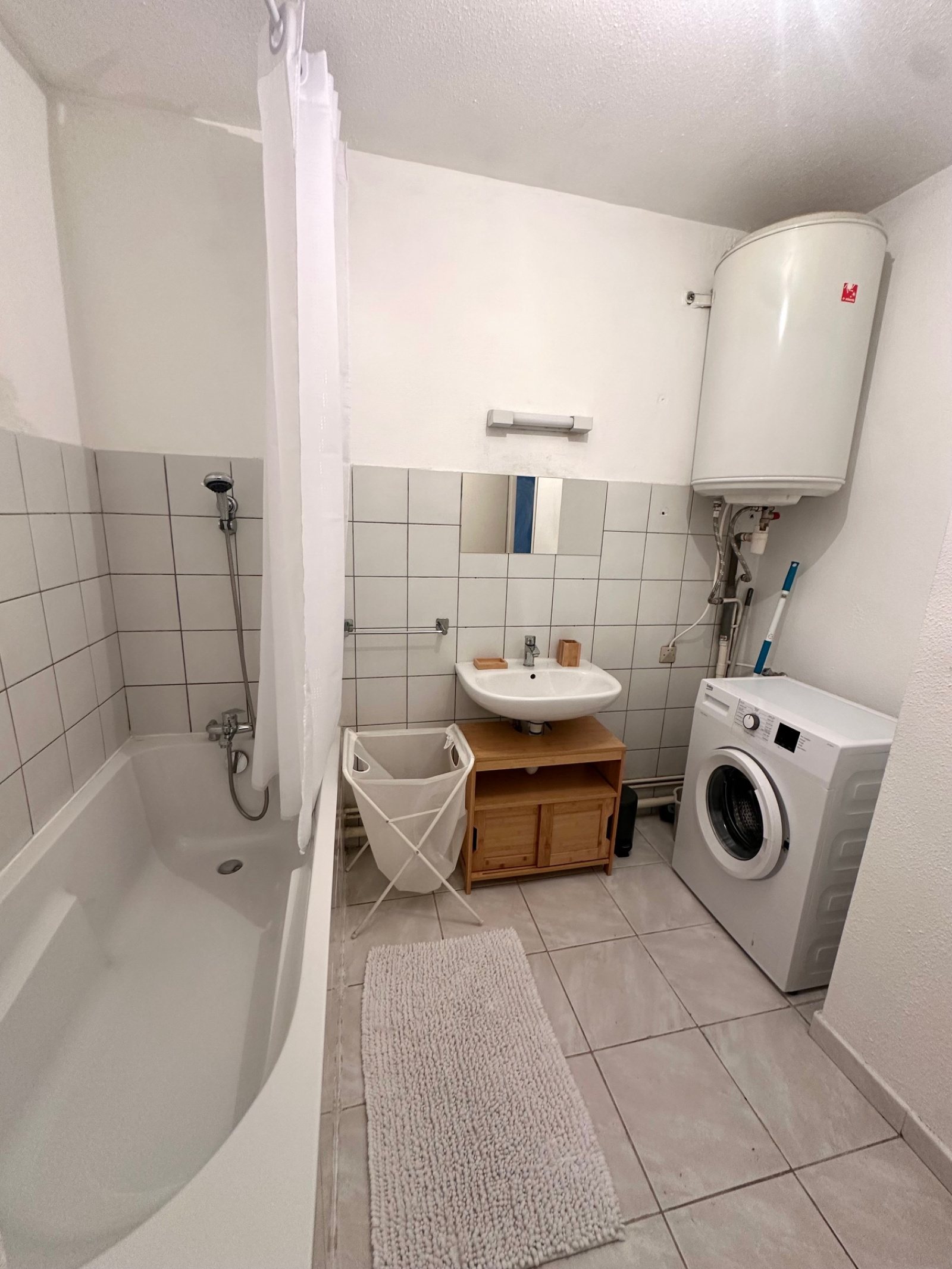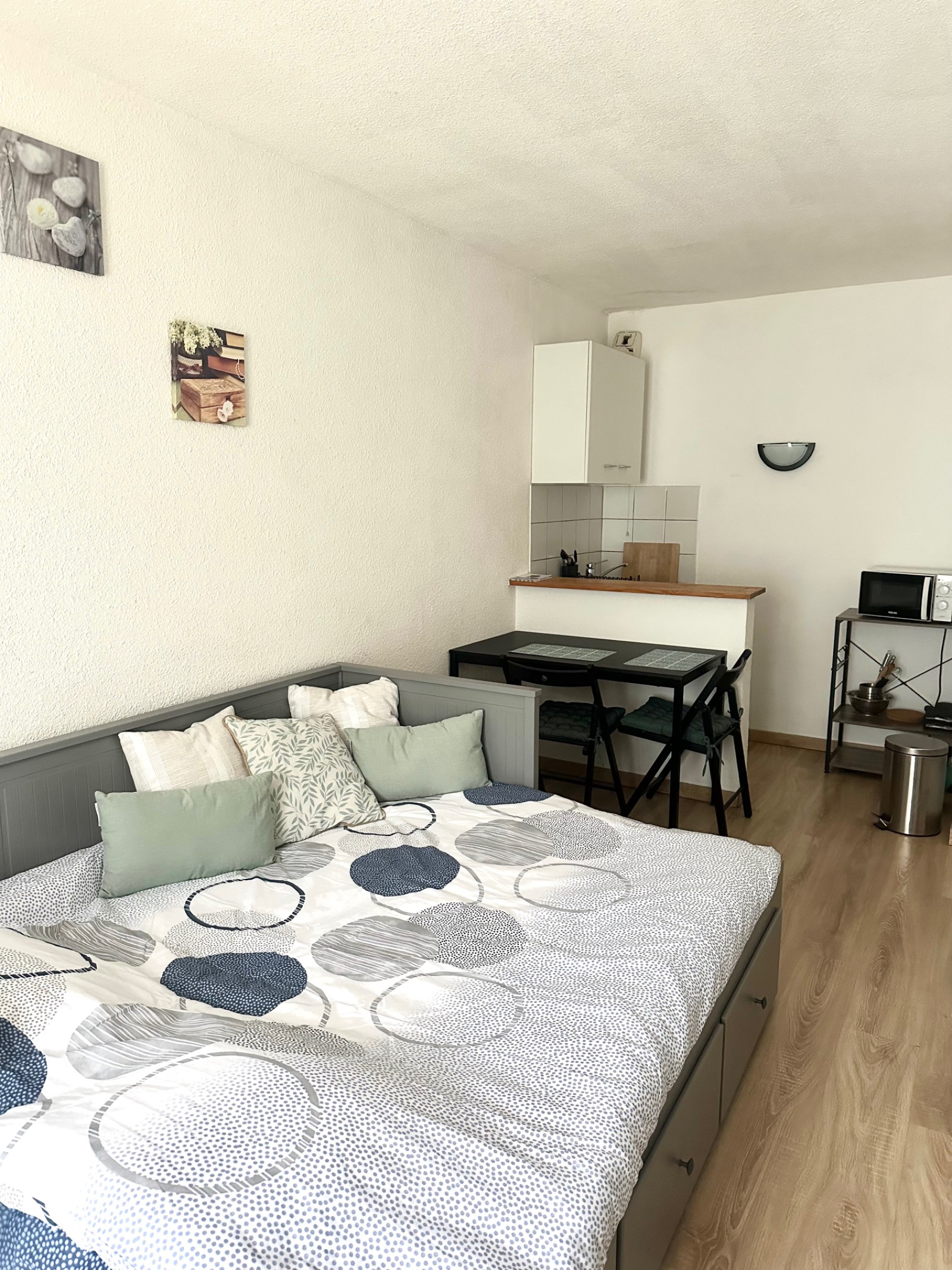 Cet appartement est composé d'un séjour lumineux, avec canapé lit 2 places, une cuisine équipée et une salle de bain avec machine à laver.avec WC;